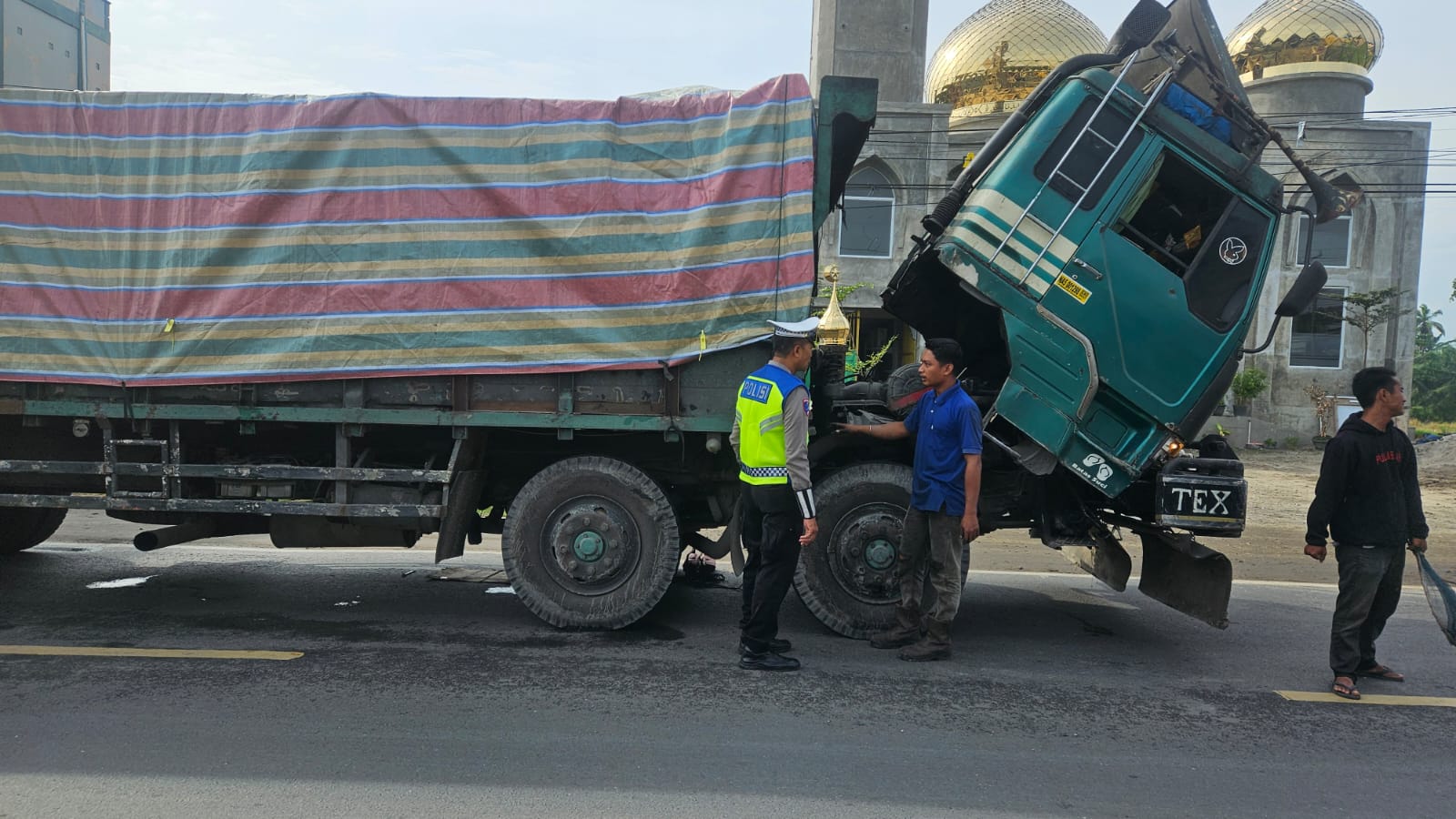 Kuala Tanjung, Batu Bara – Personel Pos Pelayanan (Pos Yan) 1 Simpang Kuala Tanjung Polres Batu Bara dengan sigap membantu pengendara truk yang mengalami kerusakan kendaraan di depan Masjid Al. Arifin, Jalinsum Medan-Kisaran, Jumat (25/12/2025).