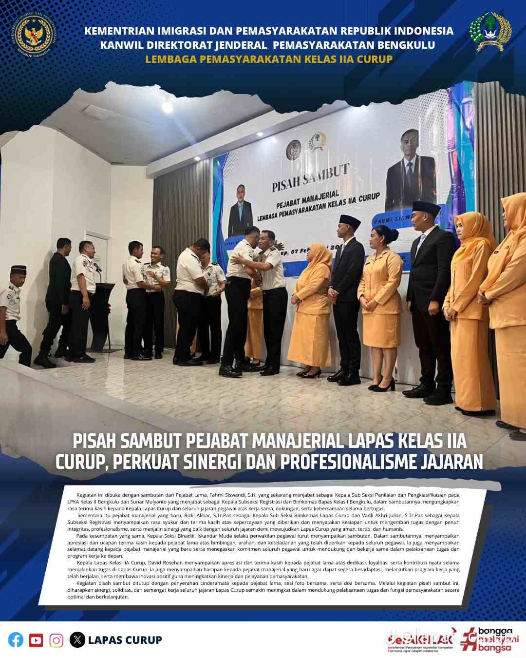 Curup – Lembaga Pemasyarakatan (Lapas) Kelas IIA Curup menggelar kegiatan pisah sambut Pejabat Manajerial sebagai bagian dari dinamika organisasi dan penyegaran struktur manajemen. Acara berlangsung di Aula Lapas Curup, Sabtu (07/02), dan dihadiri oleh Kepala Lapas Kelas IIA Curup, David Rosehan, para pejabat manajerial, jajaran pegawai, serta seluruh peserta magang.