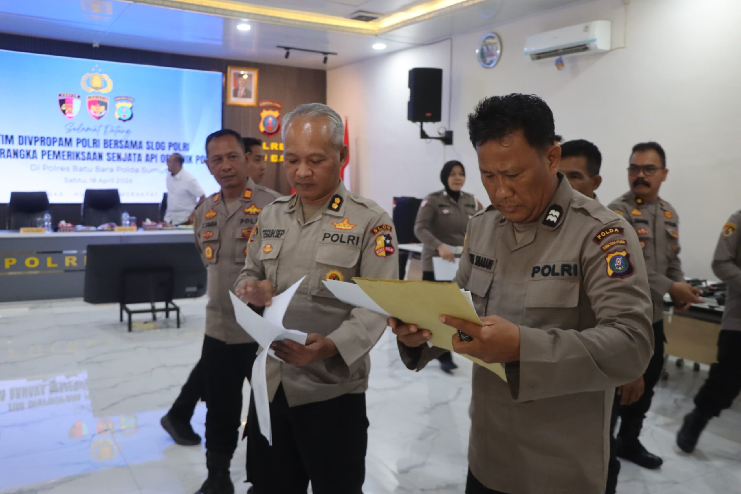Tim Divisi Profesi dan Pengamanan (Divpropam) Polri bersama Staf Logistik (Slog) Mabes Polri melaksanakan pengecekan senjata api (senpi) di jajaran Polres Batu Bara. Sabtu (18/4/2026) pukul 11.00 WIB.