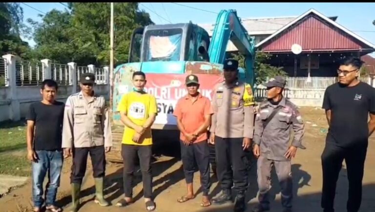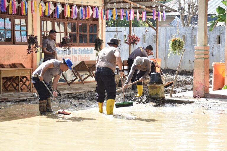 Pidie – Personel Polres Pidie bersama warga masyarakat bergotong royong membersihkan lumpur pascabencana banjir di Gampong Tanjong, Kecamatan Kembang Tanjong, Kabupaten Pidie. Kegiatan ini menyasar sejumlah titik terdampak, seperti halaman...