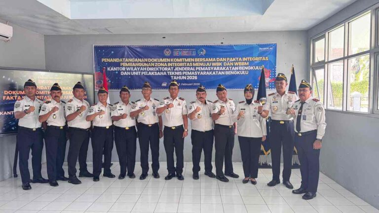 Bengkulu , 03 Febuari 2026 – Kantor Wilayah (Kanwil) Direktorat Jenderal Pemasyarakatan (Ditjenpas) Bengkulu menggelar acara Penandatanganan Dokumen Komitmen Bersama dan Pakta Integritas Pembangunan Zona Integritas (ZI) menuju Wilayah Bebas...