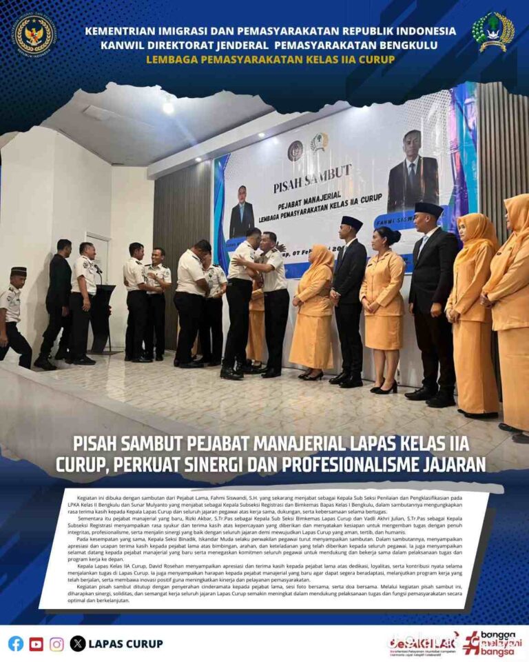 Curup – Lembaga Pemasyarakatan (Lapas) Kelas IIA Curup menggelar kegiatan pisah sambut Pejabat Manajerial sebagai bagian dari dinamika organisasi dan penyegaran struktur manajemen. Acara berlangsung di Aula Lapas Curup, Sabtu...