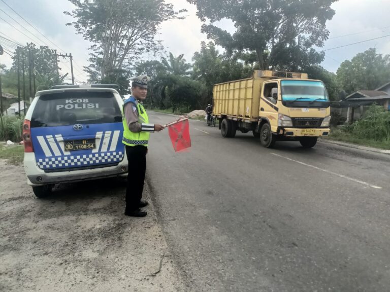 Sore Hari di Batu Bara, Polisi ‘Kibas Bendera’ Pantau Arus Lalu Lintas, Ingatkan Pengguna Jalan untuk Berhati-hati